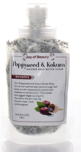 Joy of Beauty's award-winning Poppyseed & Kokum Whipped Body Scrub is diabetic-friendly and perfect for health-safe pedicures.